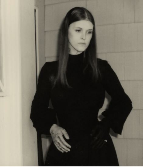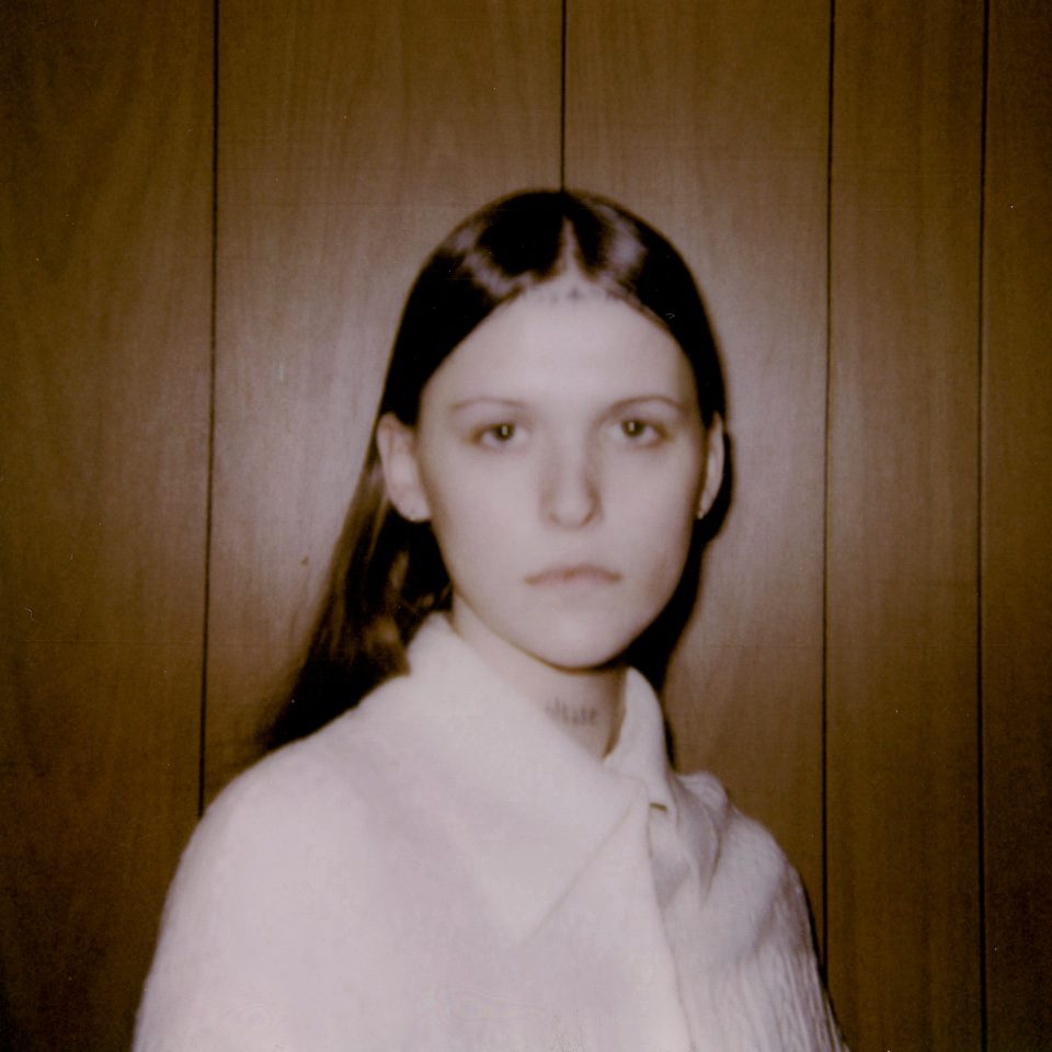 Ethel Cain staring into a Polaroid Camera. ‘Vintage’ is a heavy aesthetic in her world.
